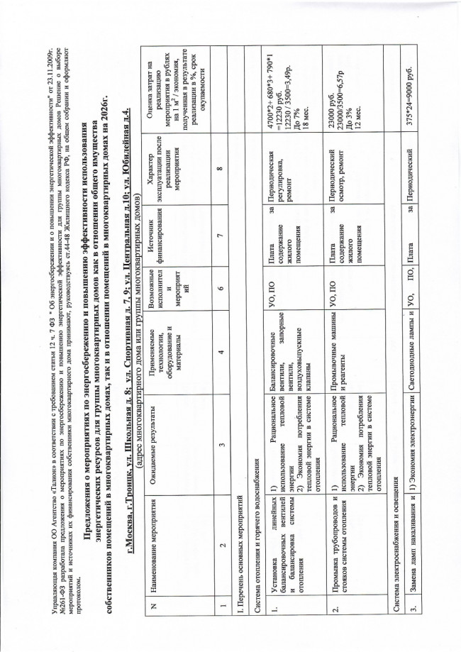 Предложения о мероприятиях по энергосбережению и повышению эффективности использования энергетических ресурсов для группы МКД на 2026г. Школьная.8, Спортивная 7,9, Центральная 10, Юбилейная 4
