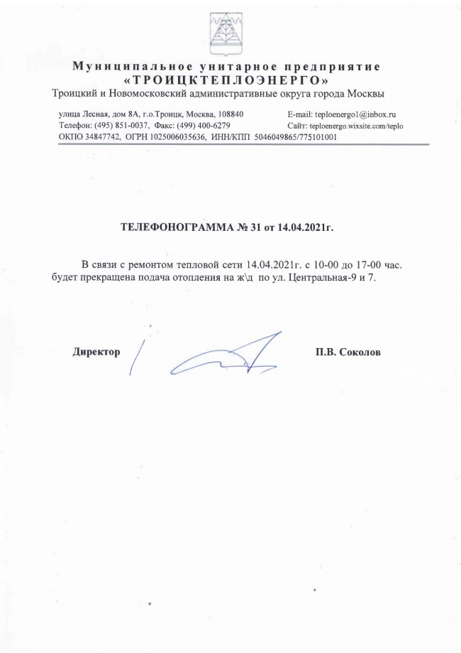 14.04.2021г. ОТКЛЮЧЕНИЕ ОТОПЛЕНИЯ И ГВС по адресу: ул. Центральная, д. 7