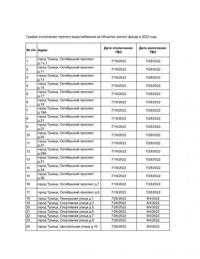 ГРАФИК ОТКЛЮЧЕНИЯ ГВС